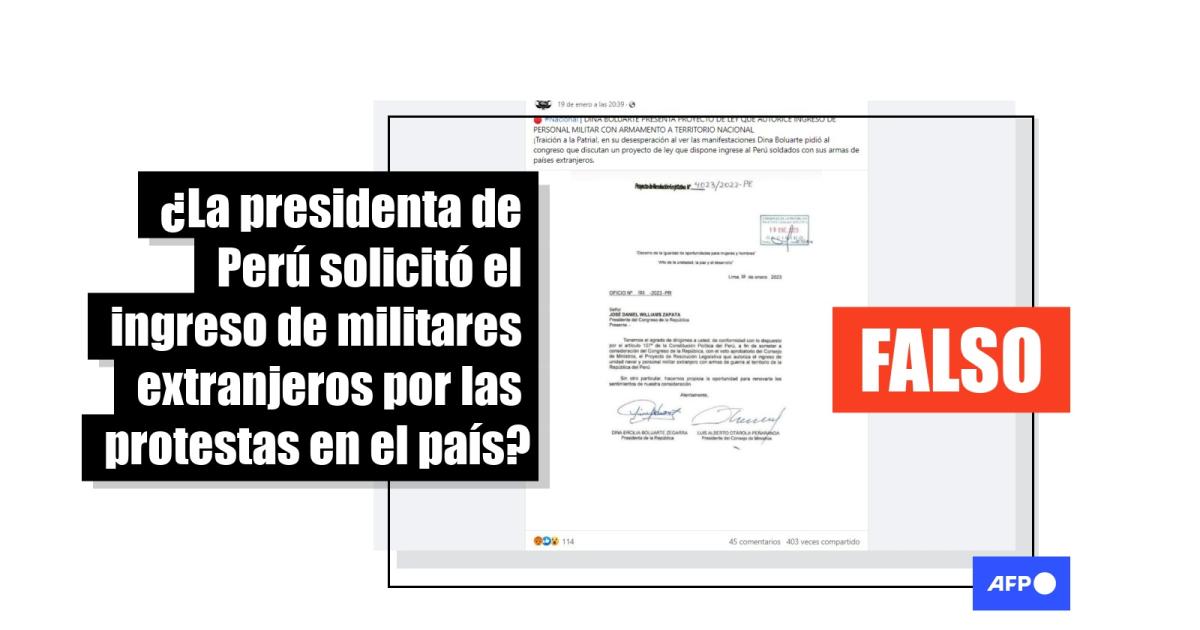 "DINA BOLUARTE PRESENTA PROYECTO DE LEY QUE AUTORICE INGRESO DE PERSONAL MILITAR CON ARMAMENTO A TERRITORIO NACIONAL ¡Traición a la Patria!, en su desesperación al ver las manifestaciones Dina Boluarte pidió al congreso que discutan un proyecto de ley que dispone ingrese al Perú soldados con sus armas de países extranjeros", dicen publicaciones en Facebook (1, 2) y Twitter.