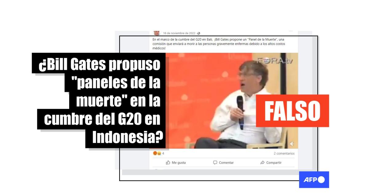 “En el marco de la cumbre del G20 en Bali, ¡Bill Gates propone un 'Panel de la Muerte', una comisión que enviará a morir a las personas gravemente enfermas debido a los altos costos médicos!”, dicen publicaciones en Facebook (1, 2, 3) y Twitter.