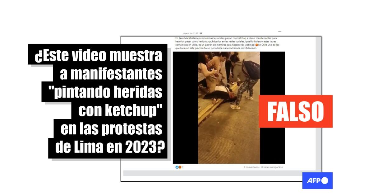 “En Perú Manifestantes comunistas terroristas pintan con ketchup a otros manifestantes para hacerlos pasar como heridos y publicarlos en las redes sociales” y “De esta forma ‘fabrican’ los muertos en las calles de Perú”, dicen pubicaciones con el video en Facebook (1, 2, 3), Twitter y TikTok, que se difunden desde el 30 de enero de 2022.