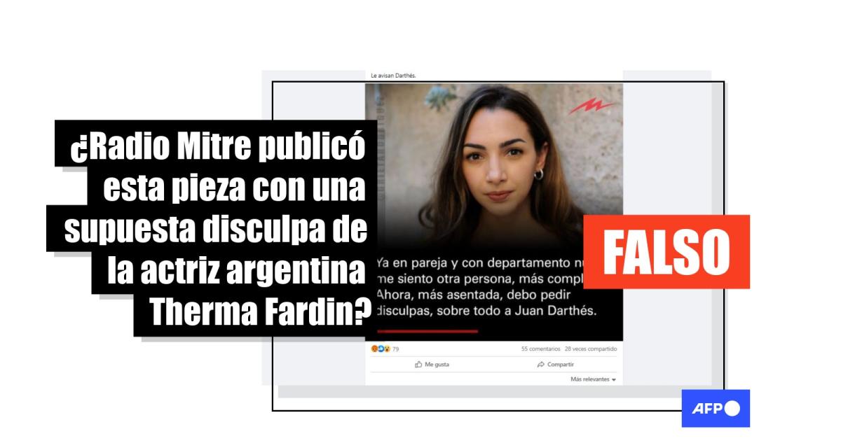 Mientras se espera la sentencia en el juicio contra el actor argentino Juan Darthés, acusado de abuso sexual, más de 1.000 usuarios de redes sociales comparten una supuesta pieza gráfica de Radio Mitre, en la que la demandante, la actriz Thelma Fardin, expresa su voluntad de disculparse con la sociedad y con el acusado. Pero no hay registro de esa publicación en las cuentas de la radiodifusora y su diseño presenta inconsistencias en comparación con el utilizado por el medio, que también negó su autoría a la AFP. Tampoco hay registro de los presuntos dichos de Fardin.