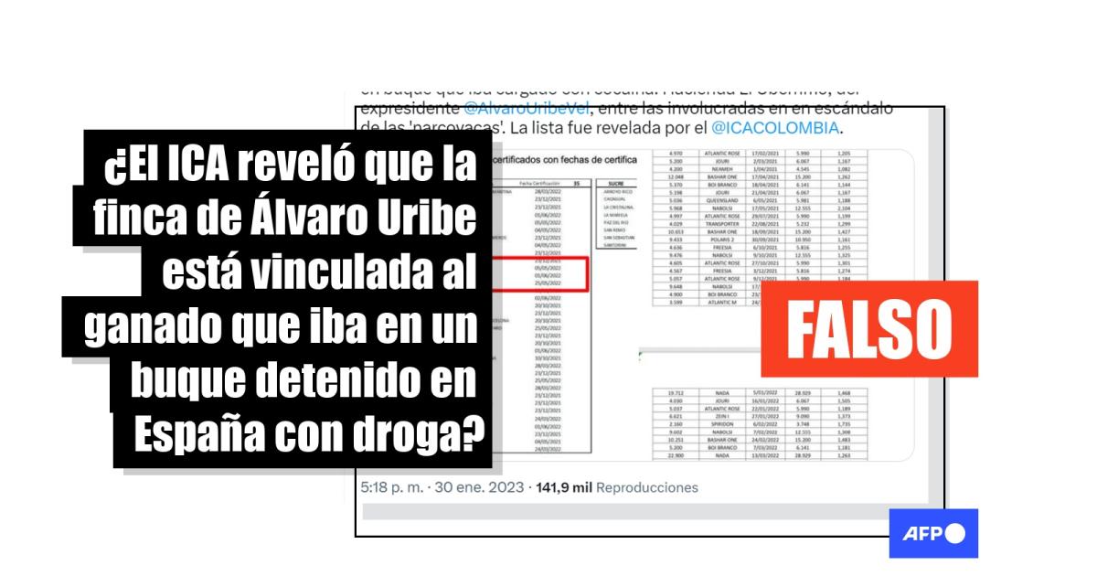 "#ATENCIÓN. Se conoce listado de las fincas que exportaron ganado en buque que iba cargado con cocaína. Hacienda El Uberrimo, del expresidente @AlvaroUribeVel, entre las involucradas en en escándalo de las 'narcovacas'. La lista fue revelada por el @ICACOLOMBIA", dice el texto compartido en Facebook (1, 2) y Twitter (1, 2).