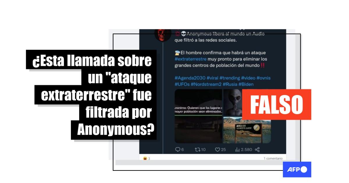 “Anonymous libera al mundo un Audio que filtró a las redes sociales. El hombre confirma que habrá un ataque #extraterrestre muy pronto para eliminar los grandes centros de población del mundo”, dice una de las entradas en Twitter (1, 2) con un audio de 00:45 segundos de duración.