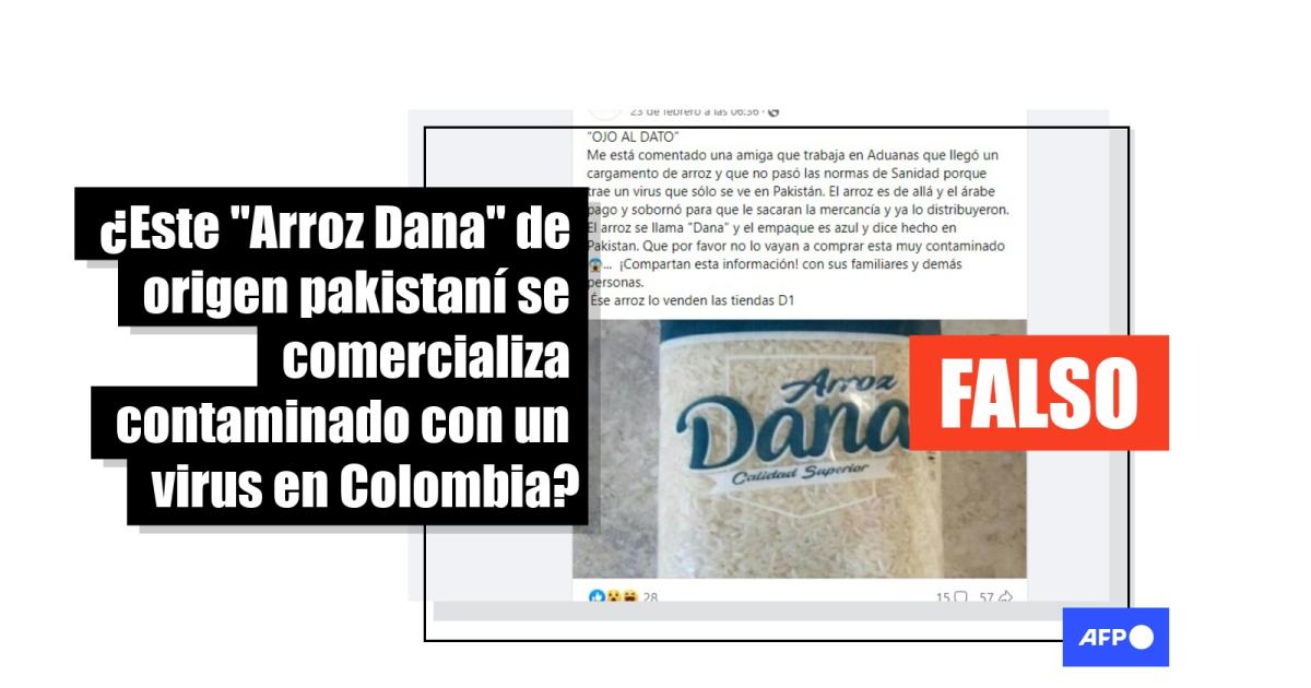 “En Aduanas llegó un cargamento de arroz que no pasó las normas de Sanidad porque trae un virus que sólo se ve en Pakistán”, dice un mensaje compartido más de 1.000 veces en redes sociales desde 2017. El texto ha vuelto a circular en 2023 en Colombia señalando que se vende en el supermercado “Tiendas D1”. Sin embargo, autoridades sanitarias de distintos países han desmentido la publicación y esa tienda colombiana descartó a la AFP vender productos de origen extranjero.
