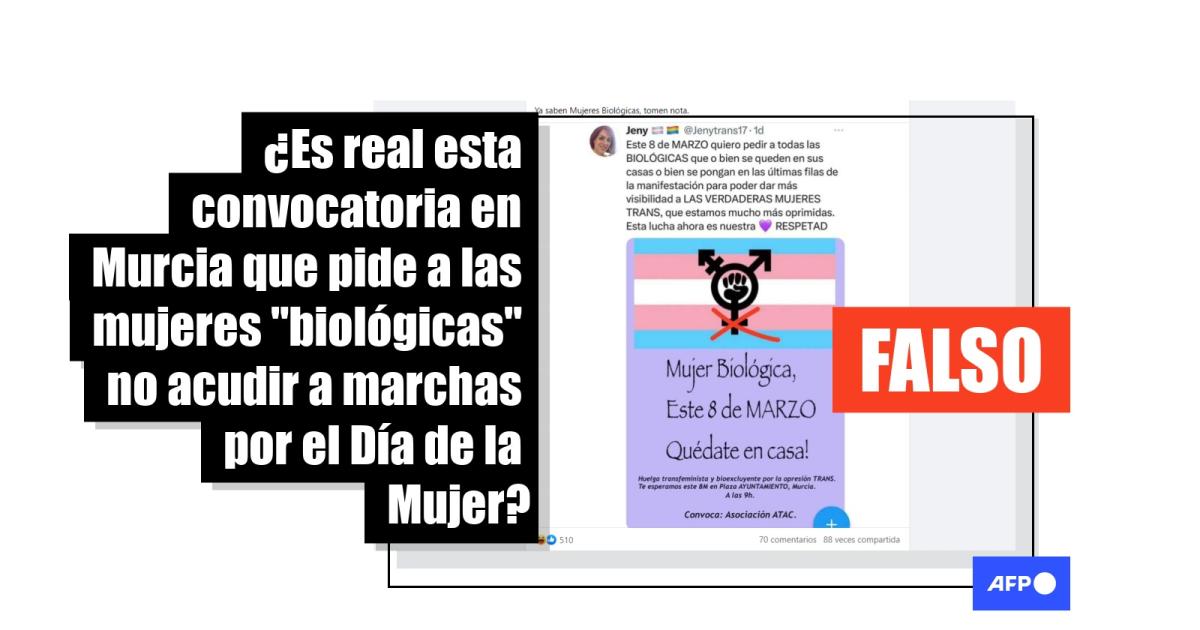 “Este 8 de MARZO quiero pedir a todas las BIOLÓGICAS que o bien se queden en sus casas o bien se pongan en las últimas filas de la manifestación para poder dar más visibilidad a LAS VERDADERAS MUJERES TRANS, que estamos mucho más oprimidas”, se lee en la captura de pantalla del tuit. El mensaje adjunta un cartel con la convocatoria de esta supuesta huelga “transfeminista y bioexcluyente” convocada en la región de Murcia, España.