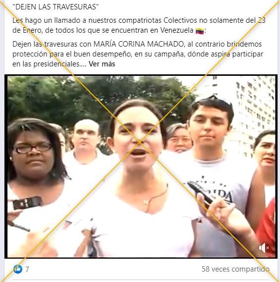 “Ya le cayeron a plomo a María Corina en el 23 de enero. Tuvo que dejar la peluca, los que andaban con ella la dejaron hablando sola y le pasaron por encima. Éso es para que vea que tiranía no sale con votos”, se lee en una de las decenas de entradas que compartieron el video en Facebook (1, 2), Twitter (1, 2), Instagram y TikTok.