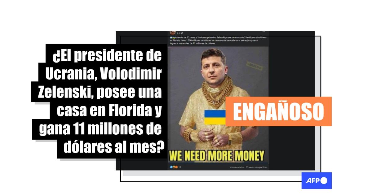 “Además de 15 casas y 3 aviones privados, Zelenski posee una casa de 35 millones de dólares en Florida, tiene 1.200 millones de dólares en una cuenta bancaria en el extranjero y unos ingresos mensuales de 11 millones de dólares”, afirman las publicaciones en Facebook (1, 2).