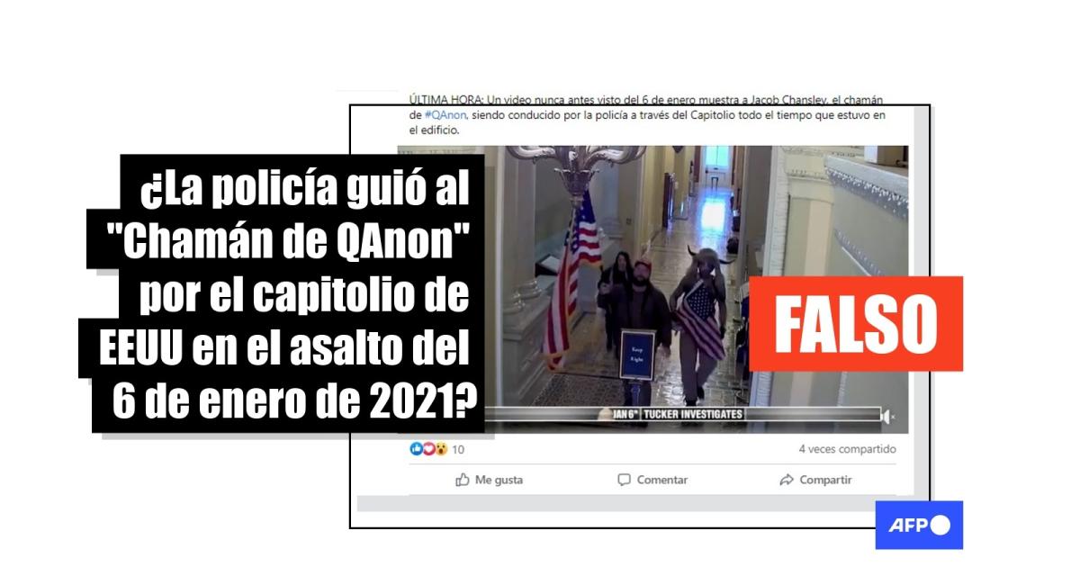 “Video nunca antes visto del 6 de enero muestra a Jacob Chansley, el chamán de QAnon, siendo conducido a través del Capitolio por la policía todo el tiempo que estuvo en el edificio. Incluso agradeció a los policías por su hospitalidad”, señalan entradas en Facebook (1, 2) y Twitter que difunden el video.
