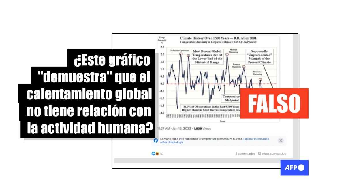 “Una imagen que desmonta la estafa del cambio climático”, afirma una publicación en Facebook, con un gráfico que supuestamente muestra “la evolución del clima mundial en los últimos 9500 años”.
