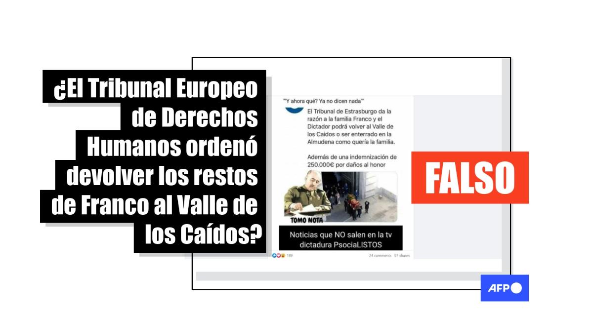 Contactado por AFP Factual el 16 de marzo de 2023, el servicio de prensa del TEDH respondió que la “única información” que podía confirmar es que el 17 de octubre de 2019 el tribunal “denegó la solicitud de medida cautelar” presentada por la Fundación Francisco Franco, presidida por familiares, “que quería bloquear el traslado de los restos” del dictador. La corte europea “no desaprobó el traslado, visto que no lo obstaculizó” en 2019.