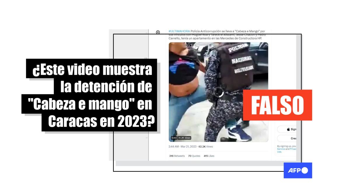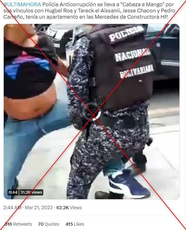 “#ULTIMAHORA Policia Anticorrupción se lleva a ‘Cabeza e Mango’ por sus vínculos con Hugbel Roa y Tareck el Aissami, Jesse Chacon y Pedro Carreño, tenía un apartamento en las Mercedes de Constructora HP”, se lee en cientos de entradas compartidas en Twitter (1, 2), Facebook (1, 2) e Instagram, que circulan desde el 21 de marzo de 2023.