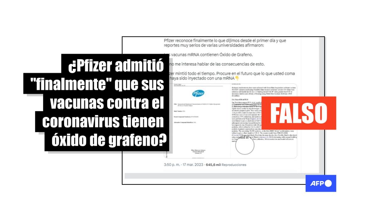 “Pfizer reconoce finalmente lo que dijimos desde el primer día y que reportes muy serios de varias universidades afirmaron: Las vacunas mRNA contienen Óxido de Grafeno”, dicen las publicaciones en Facebook (1, 2) y Twitter (1, 2) que también llegaron al WhatsApp de AFP Factual, donde usuarios envían dudas sobre contenidos para verificar.