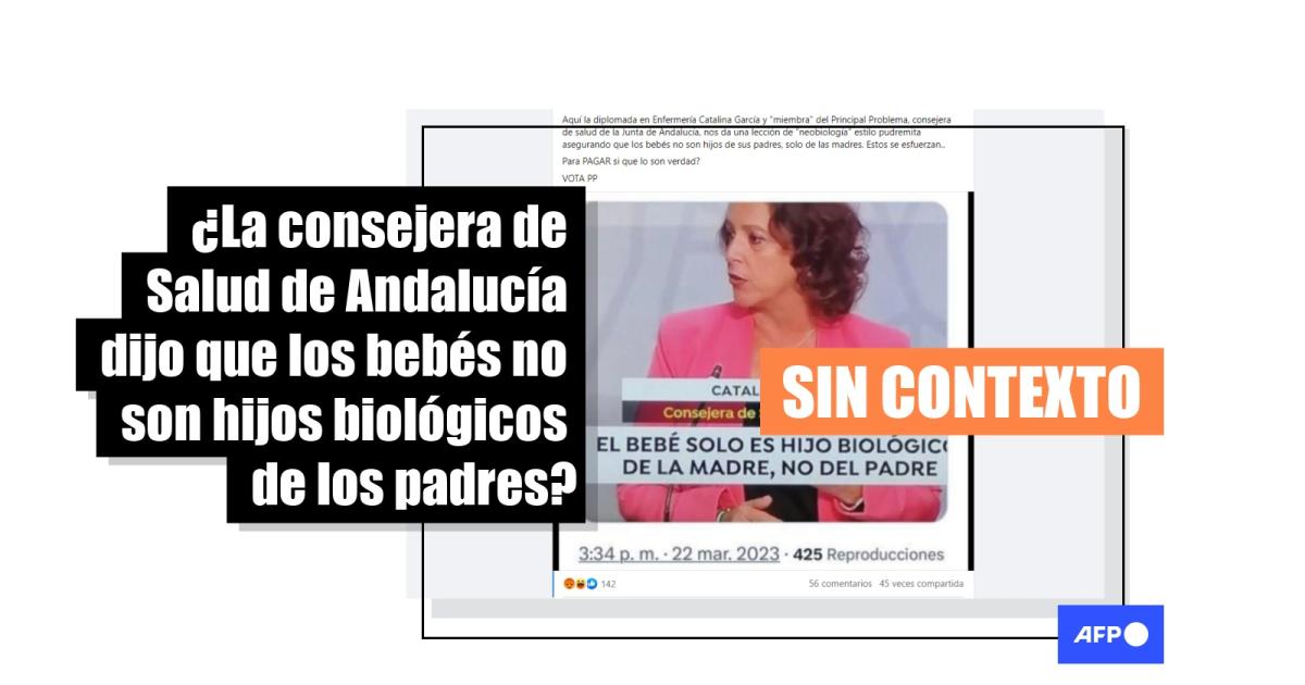“Aquí la diplomada en Enfermería Catalina García y ‘miembra’ del Principal Problema, consejera de salud de la Junta de Andalucía, nos da una lección de ‘neobiología’ estilo pudremita asegurando que los bebés no son hijos de sus padres, solo de las madres”, se lee en este tuit. El mensaje adjunta una captura de pantalla de una emisión televisiva que muestra a la consejera de Salud y Consumo de la Junta de Andalucía con un rótulo que indica: “El bebé solo es hijo biológico de la madre, no del padre”.