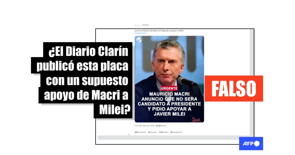 “Mauricio Macri anunció que no será candidato a presidente y pidió apoyar a Javier Milei”, se lee en una placa similar a las publicadas en las redes sociales del medio argentino Clarín.