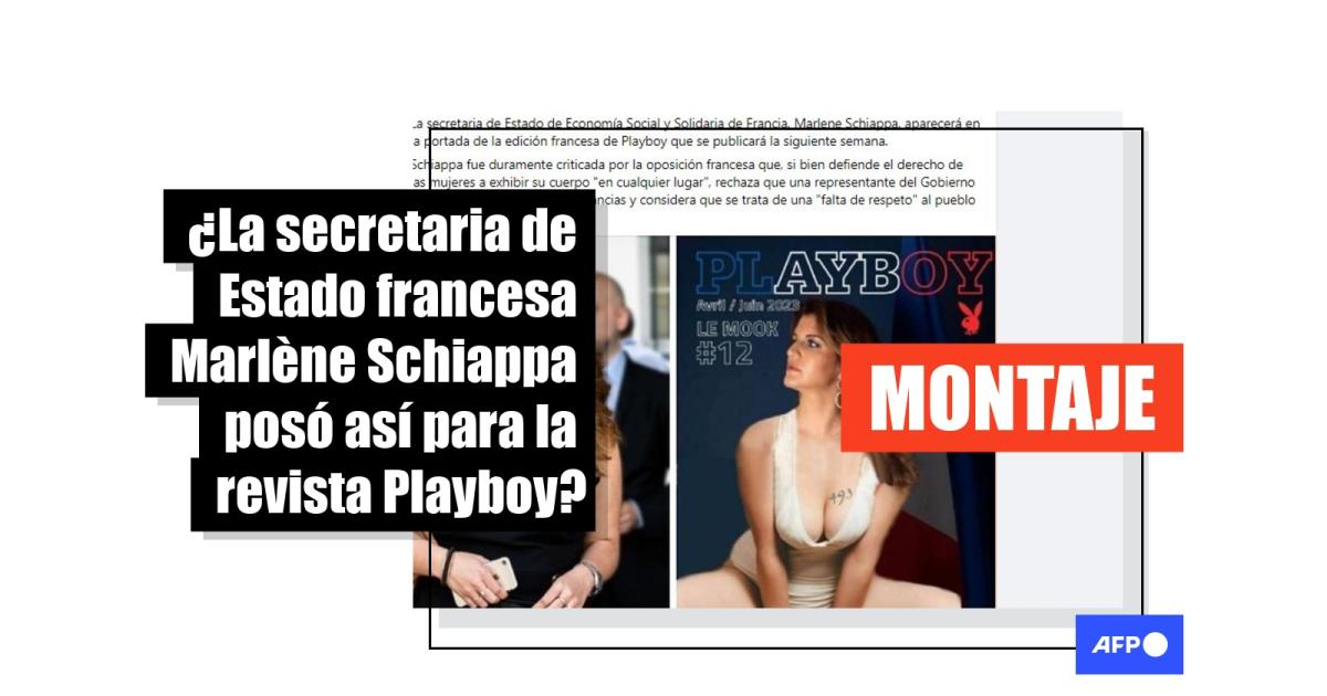 El 31 de marzo de 2023 se dio a conocer que la secretaria de Estado de Economía Social y Solidaria de Francia, Marlène Schiappa, posó y concedió una entrevista para la revista erótica Playboy. En los días posteriores, circuló decenas de veces en redes sociales y medios de comunicación la supuesta portada del número, con Schiappa en traje de baño blanco y un gran escote que deja ver un supuesto tatuaje con un número que hace referencia a un artículo constitucional. Pero es un montaje, como reconoció un usuario en Twitter. La AFP encontró la instantánea usada para elaborarlo.