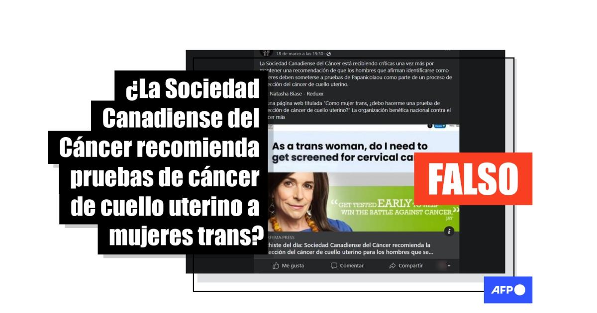 "La Sociedad Canadiense del Cáncer está recibiendo críticas una vez más por mantener una recomendación de que los hombres que afirman identificarse como mujeres deben someterse a pruebas de Papanicolaou como parte de un proceso de detección del cáncer de cuello uterino", afirma una publicación en Facebook.