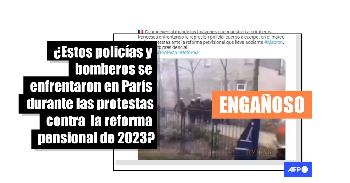 La AFP no pudo identificar informes de enfrentamientos violentos entre los bomberos y la policía durante las protestas actuales en Francia. Sin embargo, reportes aislados muestran a los bomberos participando en manifestaciones contra la reforma de las pensiones francesas, como en este directo retransmitido por la emisora BFMTV o este reportaje del diario 20 Minutos .