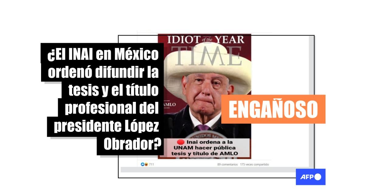 “Inai ordena a la UNAM hacer pública tesis y título de AMLO”, dicen publicaciones en Facebook y Twitter, algunas de las cuales incluyen imágenes de burla hacia López Obrador. Otras critican la supuesta decisión del INAI al afirmar que la tesis “ya es pública”.