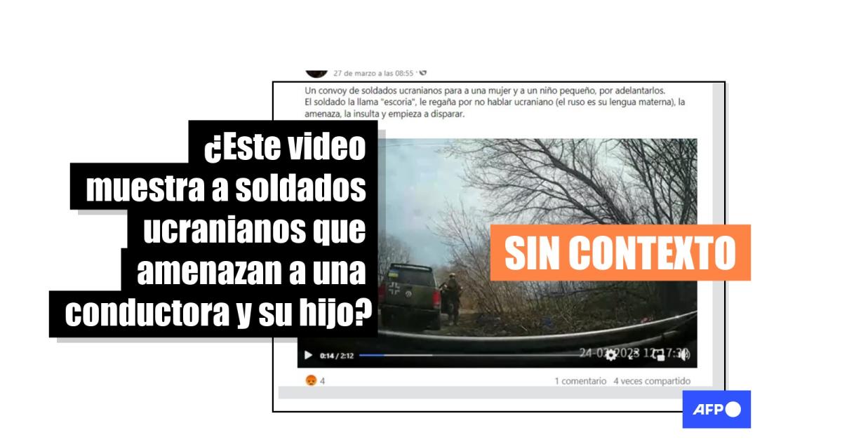 “Un convoy de soldados ucranianos para a una mujer y a un niño pequeño, por adelantarlos. El soldado la llama ‘escoria’, le regaña por no hablar ucraniano…” y “Soldados ucranianos amenazan de muerte a una mujer y su hijo”, señalan las publicaciones que acompañan el video y se han difundido por Facebook (1, 2, 3), Twitter y TikTok.