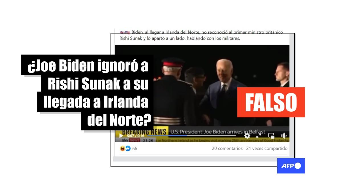 “Biden, al llegar a Irlanda del Norte, no reconoció al primer ministro británico Rishi Sunak y lo apartó a un lado, hablando con los militares”, señalan entradas en Facebook (1, 2) y Twitter.