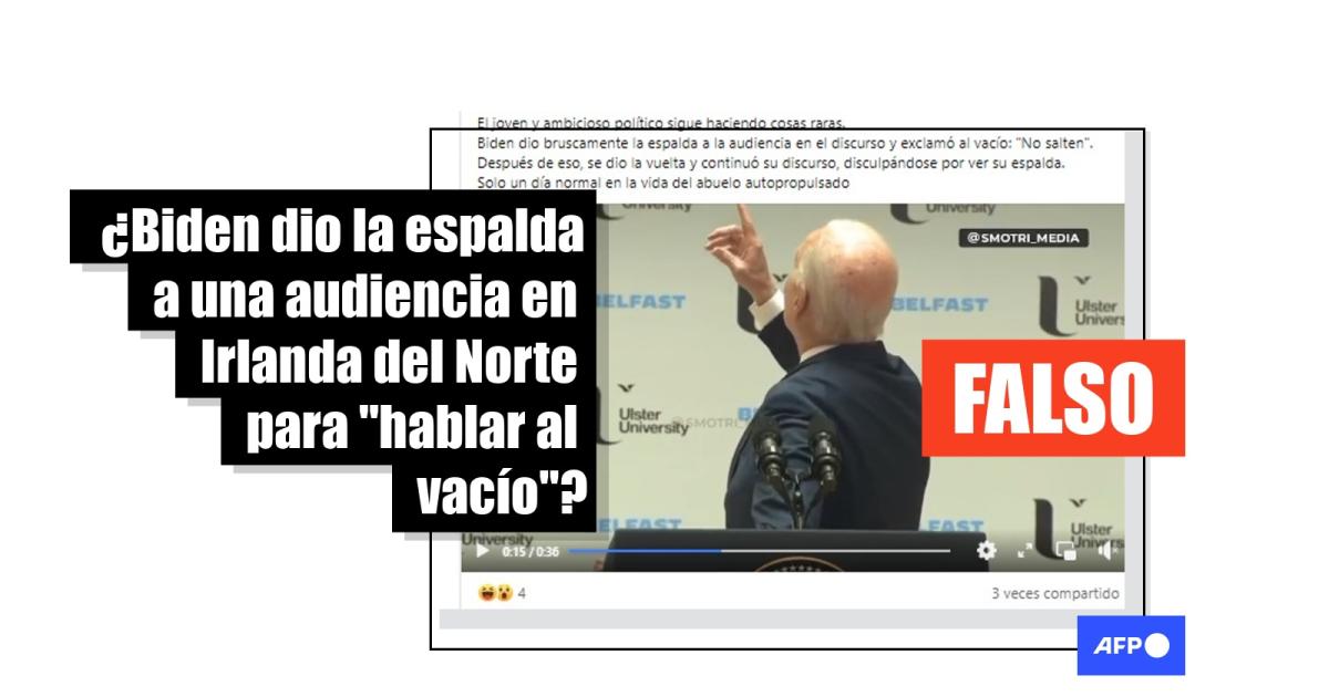 Una búsqueda inversa del video en Google con las expresiones “Biden” y “Ulster University” reveló que la secuencia viral forma parte de un discurso que pronunció el presidente de Estados Unidos el 12 de abril de 2023 en esa universidad de Irlanda del Norte.