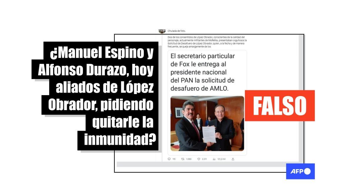 “El secretario particular de [el expresidente Vicente] Fox le entrega al presidente nacional del PAN la solicitud de desafuero de AMLO”, dicen publicaciones en Facebook (1, 2) y Twitter (1, 2) en referencia a Durazo y Espino.