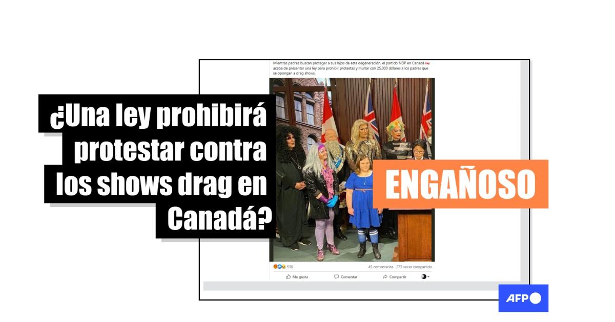 “El partido NDP en Canadá acaba de presentar una ley para prohibir protestas y multar con 25.000 dólares a los padres que se opongan a drag shows”, afirman publicaciones compartidas cientos de veces en Facebook (1, 2, 3), Twitter e Instagram.