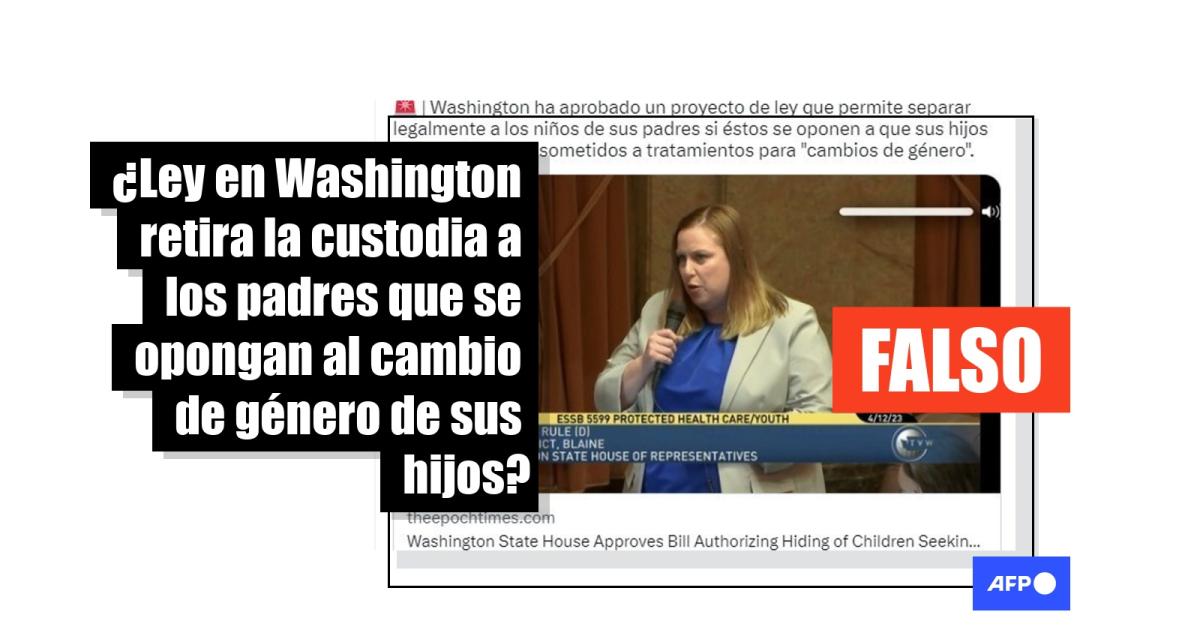 “Washington ha aprobado un proyecto de ley que permite separar legalmente a los niños de sus padres si éstos se oponen a que sus hijos sean mutilados y sometidos a tratamientos para ‘cambios de género’”, aseguran publicaciones compartidas miles de veces en Twitter, Facebook (1, 2) y TikTok desde el 15 de abril de 2023.