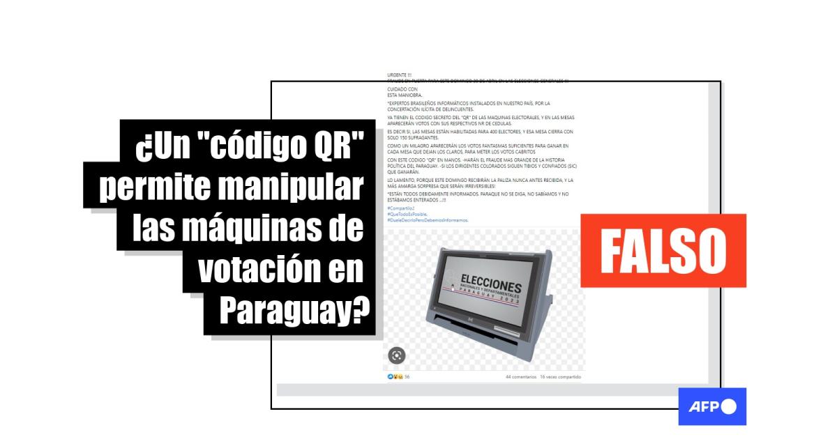 “Ya tienen el código secreto del ‘QR’ de las máquinas electorales, y en las mesas aparecerán votos con sus respectivos nr de cédulas”, se lee en una publicación en Facebook, que asegura que “con este código ‘QR’ en manos harán el fraude más grande la historia política de Paraguay”.