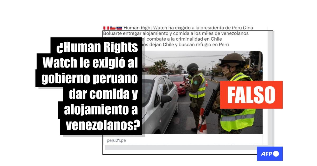 “#URGENTE Human Right Watch ha exigido a la presidenta de Perú Dina Boluarte entregar alojamiento y comida a los miles de venezolanos desplazados por el combate a la criminalidad en Chile. Ilegales venezolanos dejan Chile y buscan refugio en Perú”, asegura un usuario de Twitter. La misma afirmación circula también en Facebook (1, 2).