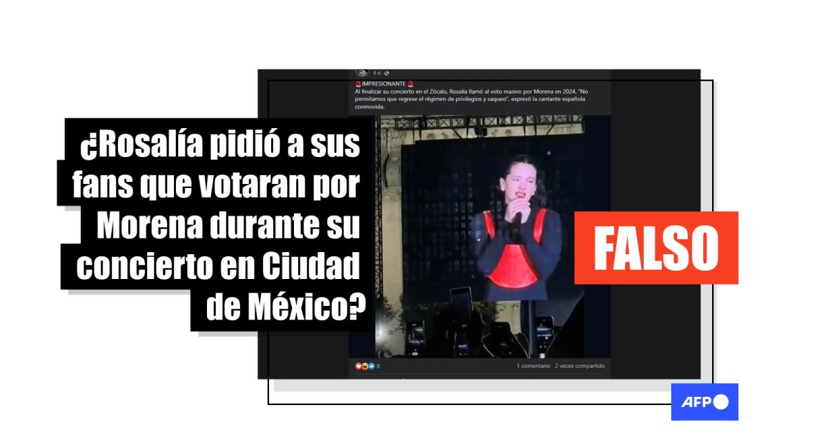 “Al finalizar su concierto en el Zócalo, Rosalía llamó al voto masivo por Morena en 2024. ‘No permitamos que regrese el régimen de privilegios y saqueo’, expresó la cantante española conmovida”, afirman publicaciones en Facebook. Entradas similares circulan en Twitter.