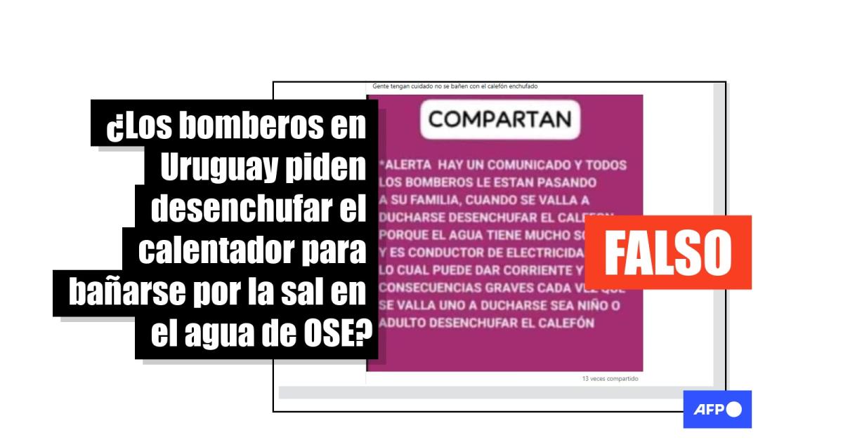 Pero el nivel de salinidad en el agua potable no provoca descargas eléctricas al bañarse con un calefón enchufado, contrario a lo que aseguran algunos cibernautas y un audio que circula con esta información. La Dirección Nacional de Bomberos tampoco hizo un comunicado que avale las publicaciones virales.