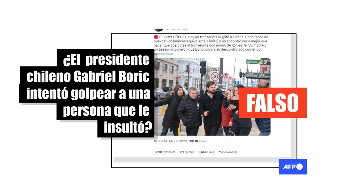 “Hoy un transeúnte le gritó a Gabriel Boric ‘saco de huevas’ (chilenismo equivalente a inútil) y no encontró nada mejor que hacer que acercarse al transeúnte con ánimo de golpearle”, narran publicaciones acompañadas de la imagen en Facebook, Twitter y Tiktok.