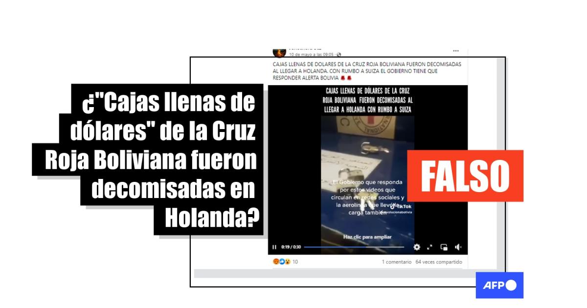 “CAJAS LLENAS DE DOLARES DE LA CRUZ ROJA BOLIVIANA FUERON DECOMISADAS AL LLEGAR A HOLANDA, CON RUMBO A SUIZA”, aseguran publicaciones compartidas en Facebook, Twitter, YouTube y Tiktok, acompañadas de un video que muestra grandes cajas metálicas apiladas, repletas de dólares.