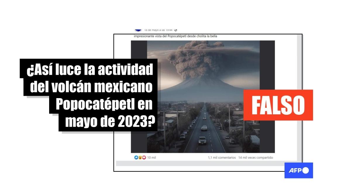 La actividad eruptiva del volcán Popocatépetl, en el centro de México, se intensificó y pasó al nivel amarillo fase 3 el 21 de mayo de 2023. En ese contexto, usuarios en redes sociales han compartido más de 20.000 veces una imagen que supuestamente retrata una enorme fumarola en el volcán vista al final de una calle. Sin embargo, el autor de la imagen confirmó a AFP Factual que fue creada con Inteligencia Artificial (IA) y como parte de una consulta sobre una erupción hipotética del Popocatépetl.