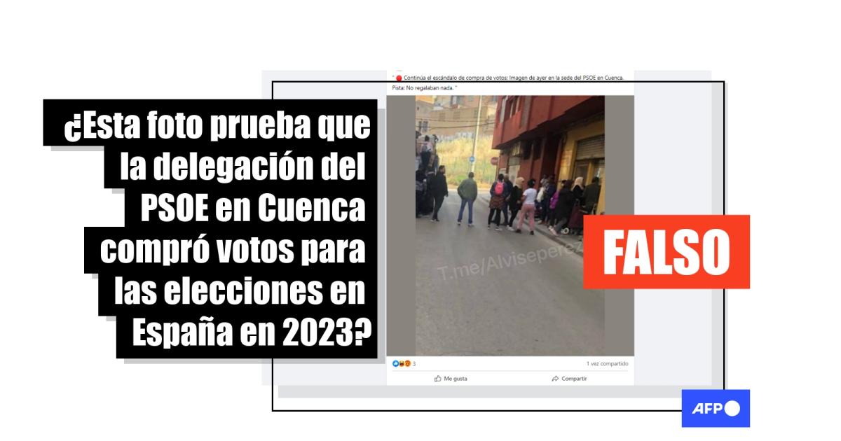“Continúa el escándalo de compra de votos: Imagen de ayer en la sede del PSOE en Cuenca. Pista: No regalaban nada”, dice un mensaje en Twitter compartido miles de veces y que adjunta una imagen de gente haciendo cola en la calle, enfrente de un local sin ningún rótulo identificativo.