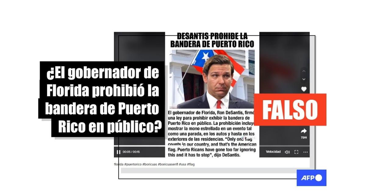 “El gobernador de Florida, Ron DeSantis; firmó una ley para prohibir exhibir la bandera de Puerto Rico en público. La prohibición incluye mostrar la mono estrellada en un evento tal como una parada, en los autos y hasta en los exteriores de las residencias”, asegura el texto de una imagen compartida más de 15.000 veces en TikTok (1, 2) y Facebook (1, 2).