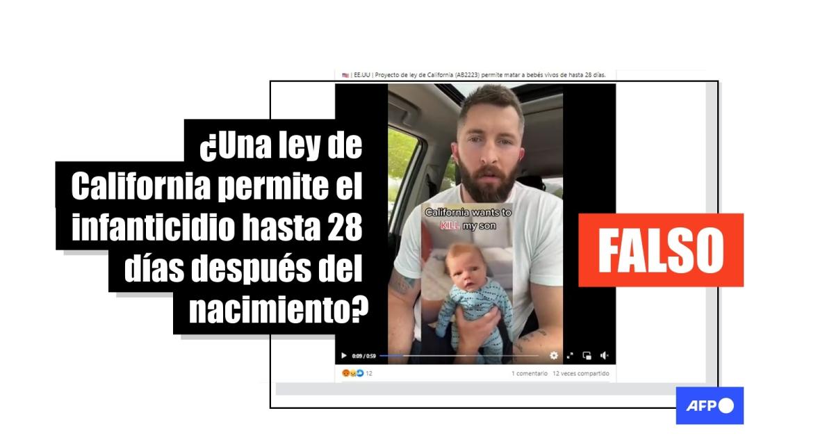 Las entradas viralizadas van acompañadas de un video en el que un hombre asegura en inglés que California “quiere matar” a su hijo y que la ley AB 2223 (Assembly Bill No. 2223) “volverá absolutamente legal matar a bebés no solo en el útero, sino también fuera del útero hasta los 28 días tras el nacimiento”.