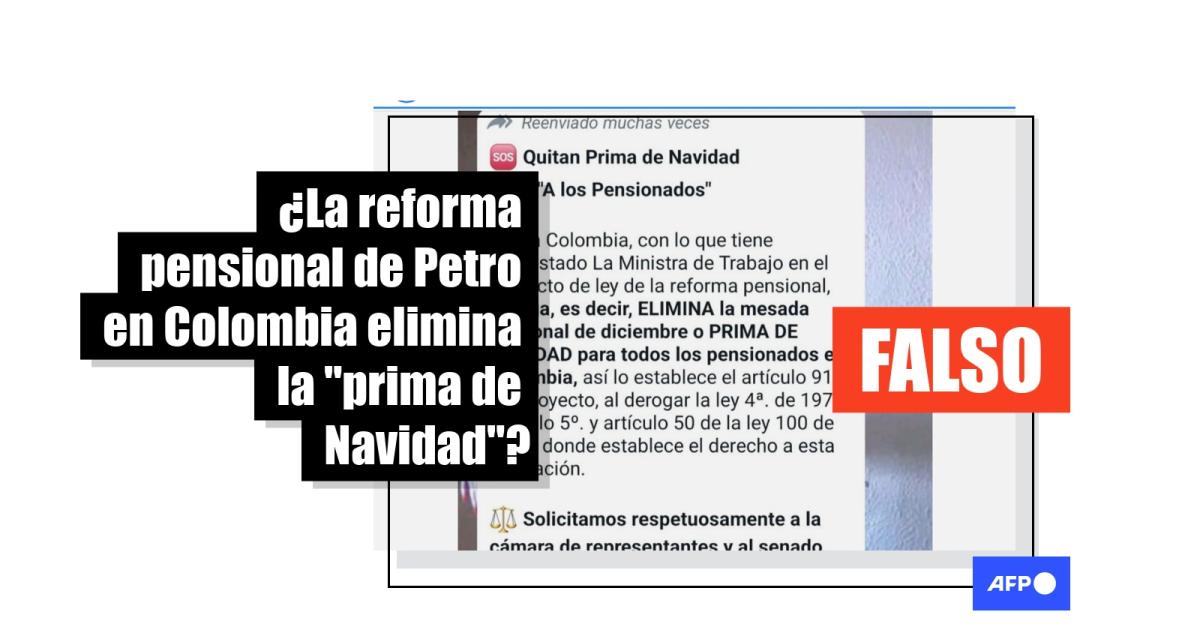 "Quitan Prima de Navidad a los Pensionados. Alerta Colombia, con lo que tiene orquestado La Ministra de Trabajo en el proyecto de ley de la reforma pensional, *deroga, es decir, ELIMINA la mesada adicional de diciembre o PRIMA DE NAVIDAD para todos los pensionados en Colombia", dice uno de los mensajes difundidos en Facebook (1, 2), Twitter y TikTok.