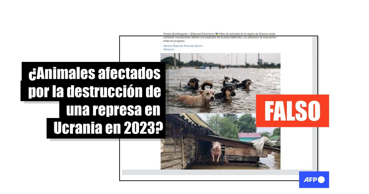 La AFP y medios de comunicación han exhibido la evacuación de personas junto con sus mascotas en las áreas inundadas por la destrucción de la represa de Kajovka, pero las fotografías difundidas en redes sociales no tienen relación con este hecho.
