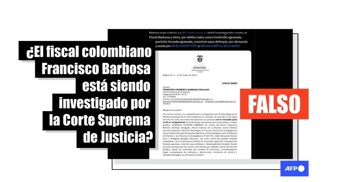 “Refrescante noticia: La Corte Suprema abrió investigación contra el Fiscal Barbosa y otros, por delitos tales como homicidio agravado, desaparición forzada agravada, concierto para delinquir, por denuncia interpuesta por el periodista Gonzalo Guillén”, señalan entradas en Twitter (1, 2). Afirmaciones similares también se comparten en Facebook (1, 2).