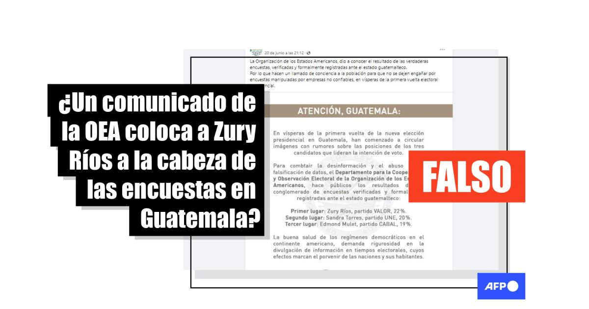 “Toda la información de ese comunicado es falsa y la OEA no realiza encuestas”, confirmó la Misión de Observación Electoral de Guatemala a AFP Factual vía correo electrónico, el 23 de junio de 2023.