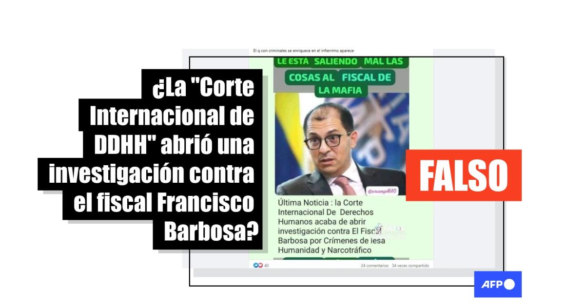 “Última Noticia : la Corte Internacional De Derechos Humanos acaba de abrir investigación contra El Fiscal Barbosa por Crímenes de lesa Humanidad y Narcotráfico”, dice una captura de pantalla compartida en Facebook (1, 2) y TikTok (1, 2) desde junio de 2023.