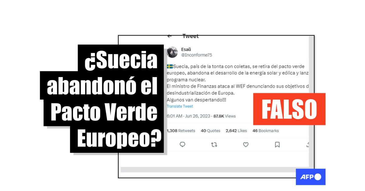 En las declaraciones recogidas por Reuters, Svantesson tampoco dice que Suecia vaya a abandonar el Pacto Verde. La AFP no encontró rastro de esa supuesta declaración en otros medios.