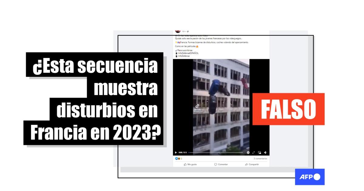 “En las redes aparece este video. Quizás solo sea la pasión de los jóvenes franceses por los videojuegos… Francia. Formas bizarras de disturbios, coches volando del aparcamiento”, se lee en una publicación en Telegram. El mensaje adjunta un vídeo de 13 segundos que muestra cuatro coches cayendo al vacío desde un edificio y explotando al impactar con la calle.
