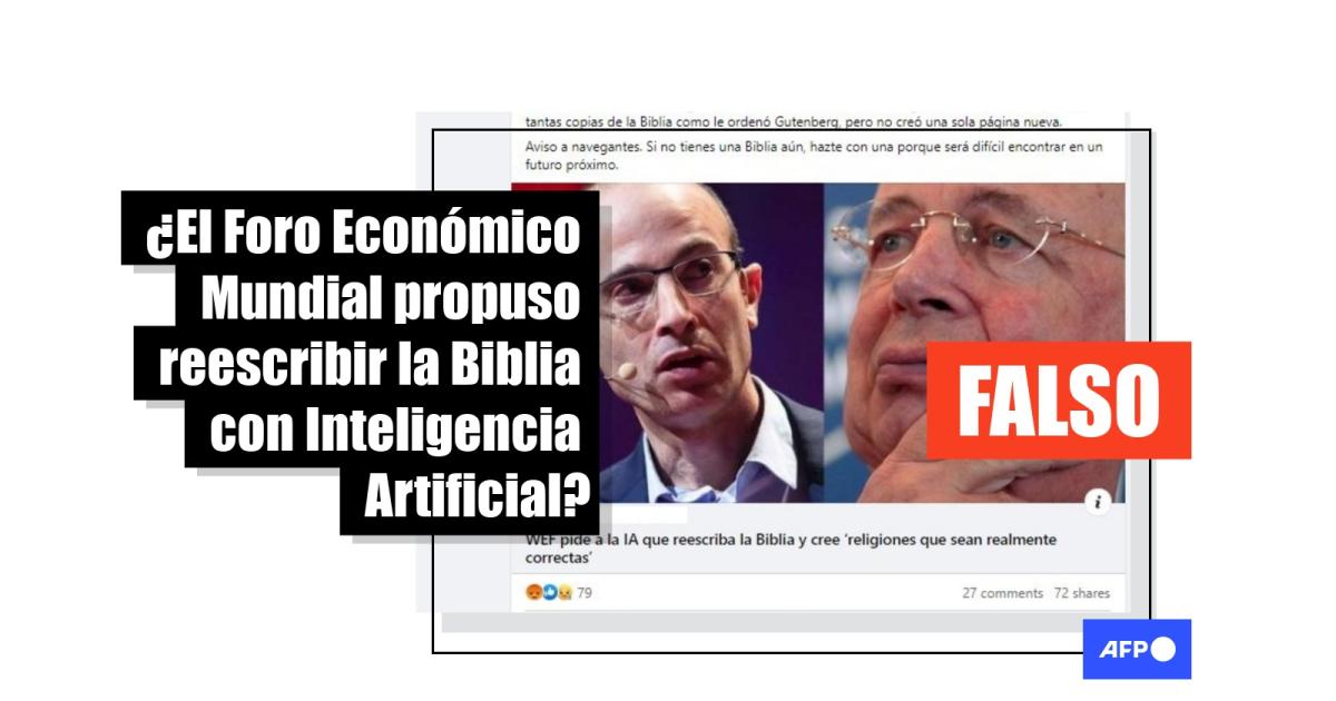 La información apareció en páginas web como esta, que tituló: “WEF [siglas en inglés del FEM] pide a la IA que reescriba la Biblia y cree ‘religiones que sean realmente correctas’”, o esta, que habla de un “alto funcionario” del foro como origen de la propuesta. Los artículos fueron compartidos en Facebook, donde se retomó el mensaje para decir, por ejemplo: “Yuval Noah Harari, asesor principal del WEF y su presidente, Klaus Schwab, argumenta que el uso de IA para reemplazar las escrituras creará ‘religiones unificadas que en realidad son correctas’”.