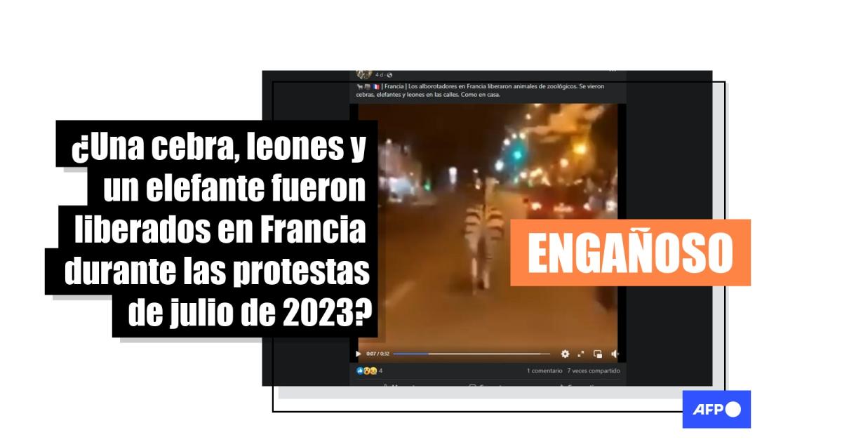 “Los alborotadores en Francia liberaron animales de zoológicos. Se vieron cebras, elefantes y leones en las calles”, dicen las publicaciones en Facebook (1, 2).