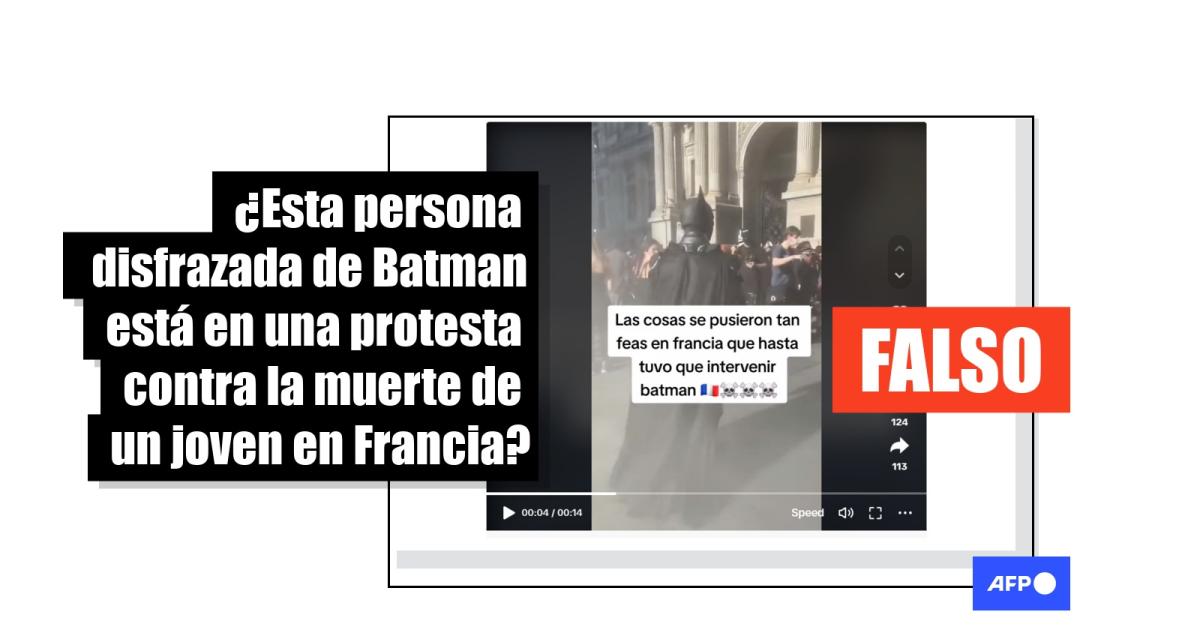 “Las cosas se pusieron tan feas en francia que hasta tuvo que intervenir batman”, dicen algunas de las publicaciones en Facebook y TikTok, que muestran un video de una persona disfrazada de Batman que camina entre una multitud de individuos, algunos de ellos con pancartas.
