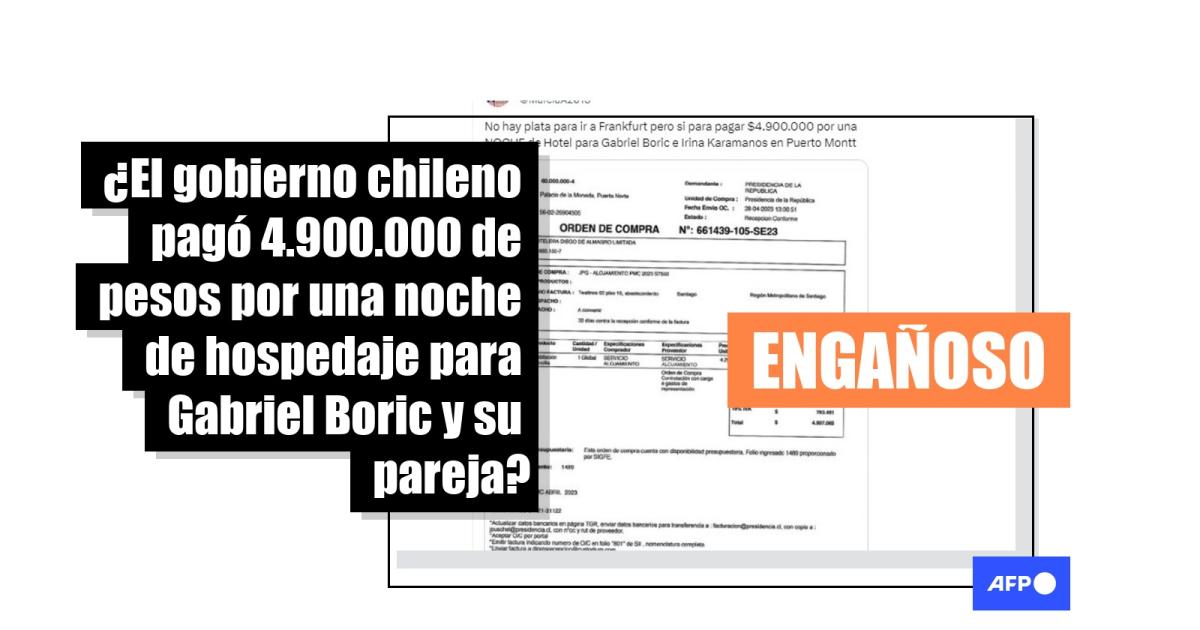 “No hay plata para ir a Frankfurt pero si para pagar $4.900.000 por una NOCHE de Hotel para Gabriel Boric e Irina Karamanos en Puerto Montt” afirman publicaciones en Twitter, Facebook, Tiktok e Instagram, acompañadas de la imagen de una factura de la Presidencia de la República.