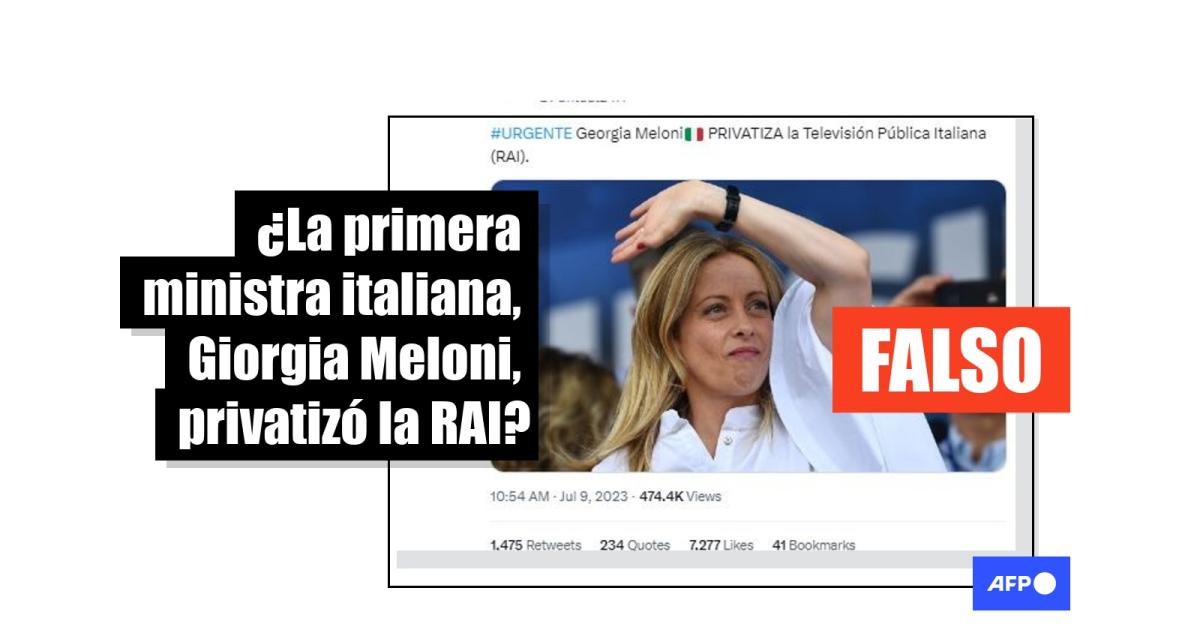 “#URGENTE Georgia [sic] Meloni privatiza la Televisión Pública Italiana (RAI)”, se lee en un tuit publicado el 9 de julio por el blog “El Puntual 24H”. La afirmación fue compartida en Twitter, Facebook e Instagram e incluso replicada por un precandidato a jefe de Gobierno de la Ciudad de Buenos Aires por el partido La Libertad Avanza.