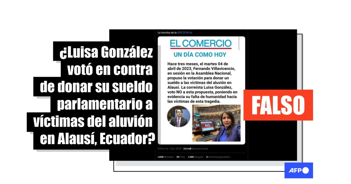 “Hace tres meses, el martes 04 de abril de 2023, Fernando Villavicencio, en sesión en la Asamblea Nacional, propuso la votación para donar un sueldo a las víctimas del aluvión en Alausí. La correísta Luisa González, voto NO a esta propuesta, poniendo en evidencia su falta de humanidad hacia las víctimas de esta tragedia”, dice la pieza gráfica compartida en Facebook (1, 2) y Twitter (1, 2).
